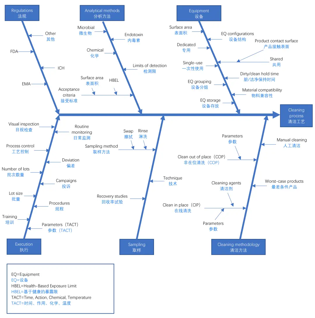 已验证的清洁工艺取决于多方面通过监控最关键的方面来确保一致性和重现性。这些要素的变更通过变更管理进行控制。图11.1所示的鱼骨图说明了已验证的清洁工艺的控制要素。