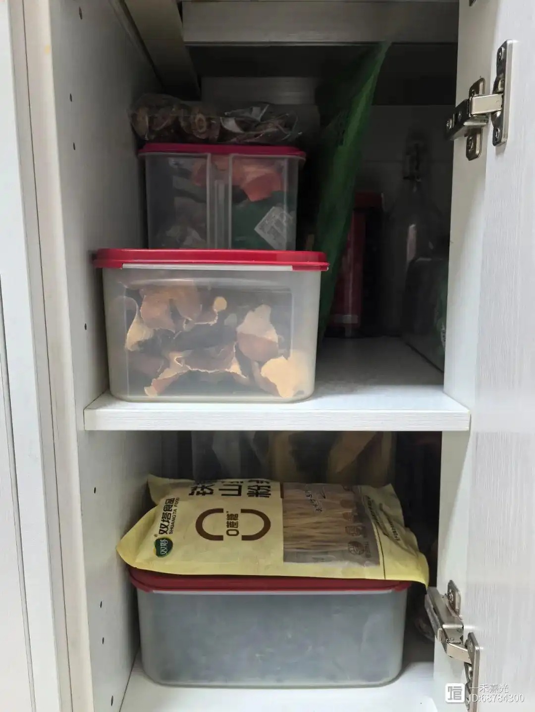 下层外部:1盒干紫苏叶、1包粉条,(收纳盒里)半包木耳、4袋冰糖。