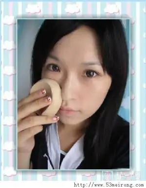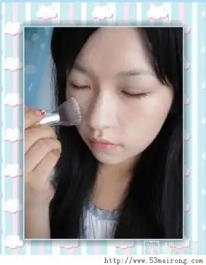 用粉粉扑修饰,拍擦使妆容更贴合皮肤,注意鼻翼、眼角、下巴等地方。