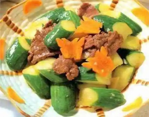 【黄瓜炒牛肉】做法:1.黄瓜切片,牛肉横纹切片腌制好,红萝卜切花,生姜切片,蒜子切茸;2.烧锅下油,放入黄瓜片,攒入酒,加入少许上汤,调入少许盐、味精,炒至八成熟,铲起待用。3.烧锅下油,下蒜茸、姜片、红萝卜爆香,放入牛肉,攒入酒,加入剩余上汤,调入上述调味料,将牛肉滑炒至仅熟,加入黄瓜炒均,用湿生粉勾芡,下包尾油,上碟即成。