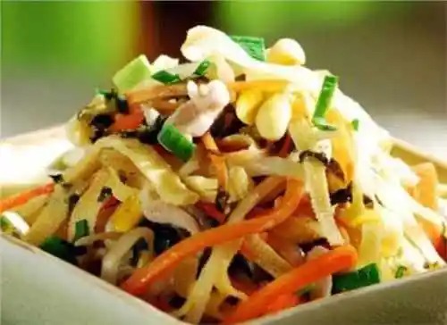 【雪菜杂炒】1.将肉丝用少许的鸡精、糖与油拌匀,静置10分钟;2. 黄豆芽去根,百叶切、胡萝卜切丝,香蒜切碎;3. 锅内热油,六成热时,将肉丝下入,迅速滑散,一变色即盛出;4. 锅洗净,重新热油,六成热时下入雪里蕻煸炒出香味,放适量的糖炒匀,再依次下入黄豆芽、胡萝卜、百叶炒匀;5.下入肉丝炒匀,放适量鸡精调味;6. 临起锅前放入香蒜,迅速炒匀即可。
