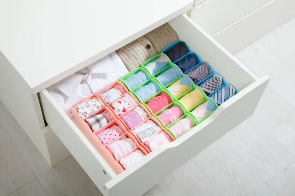 另外,我们还会有一些丝袜,冬季打底裤、厚袜子、手套、帽子等这些冬季取暖的小物品,可以把它收纳在衣柜里面的抽屉柜里面,或者是家里比较方便合适的一个抽屉柜里面,最好**分格架装在里面会更加干净方便。