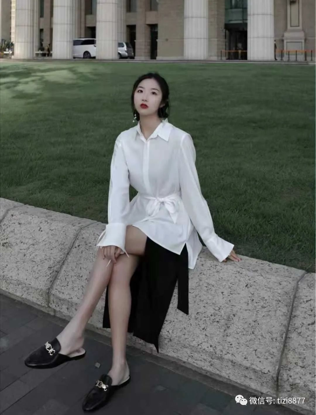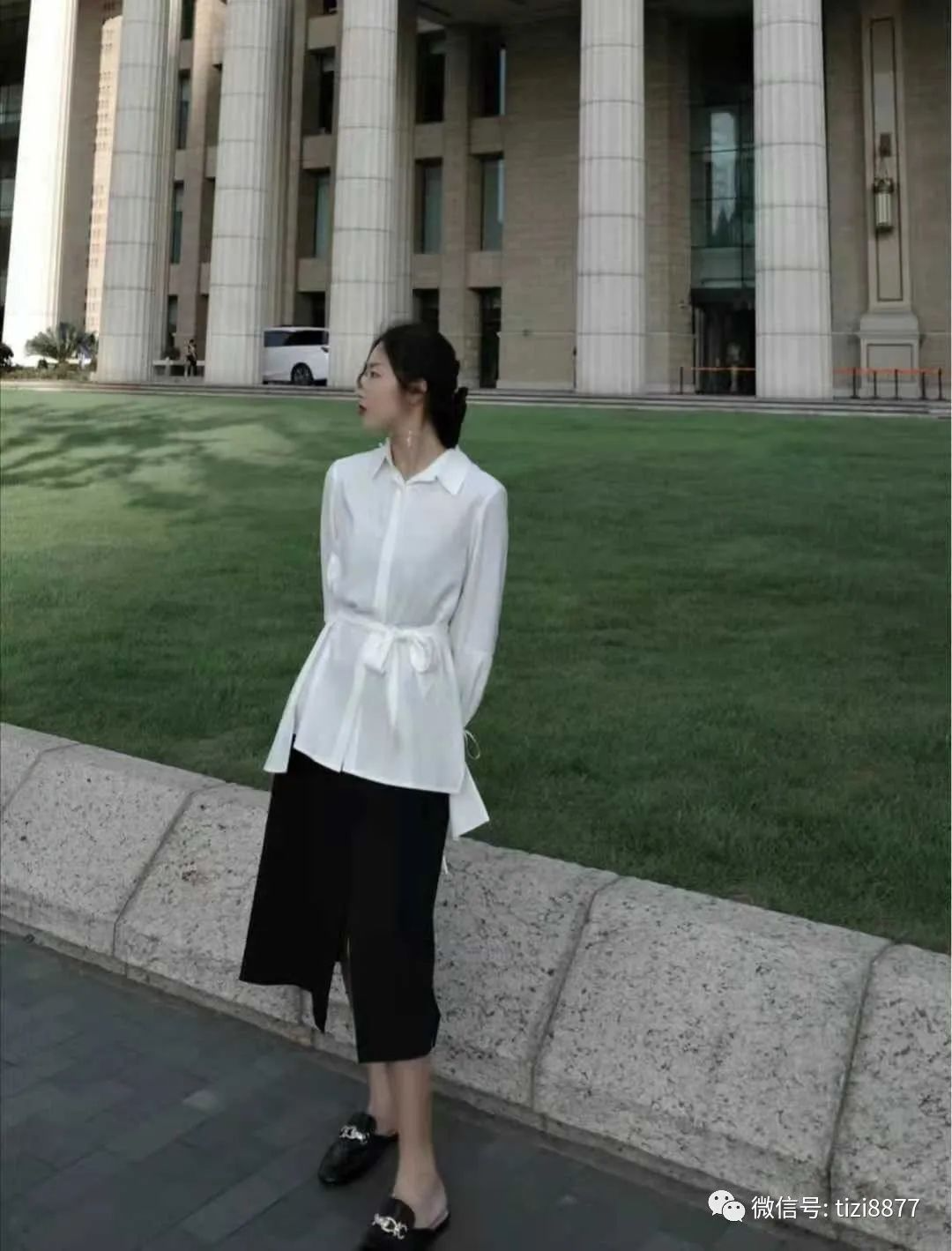 look7 白色设计感衬衫+黑色高开叉半身裙+黑色乐福鞋
