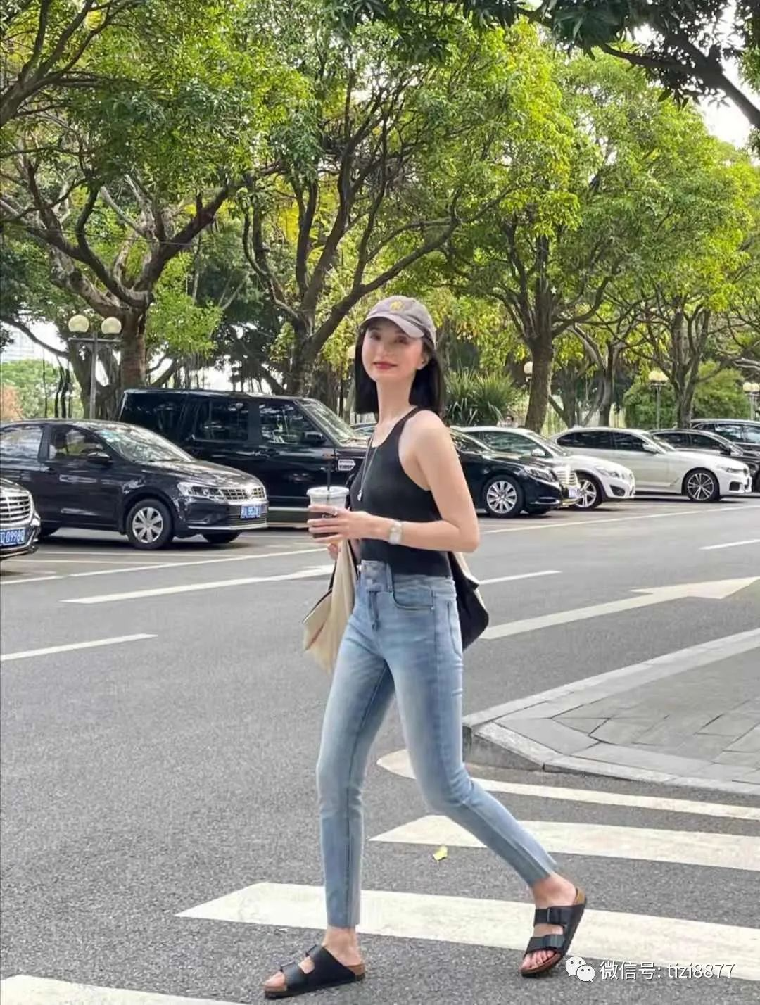 这身街头甜酷搭配,上衣是黑色的背心,炎热的夏天,单穿背心凉快又时尚,下半身搭配的牛仔裤是修身的版型,浅蓝色也很适合夏天,裤子的料子舒适透气,上身特别的显瘦,脚上穿了黑色的拖鞋呼应上衣。
