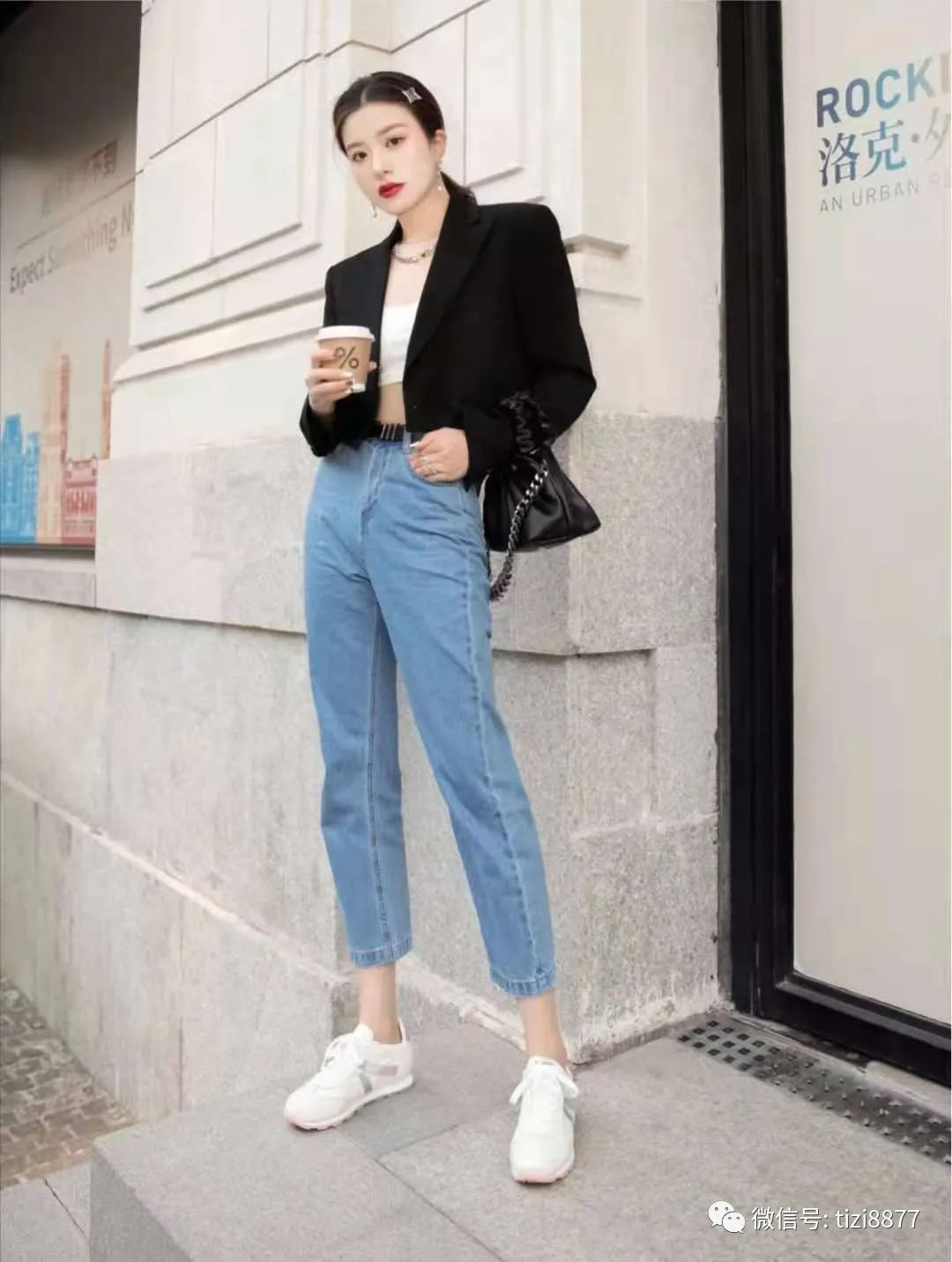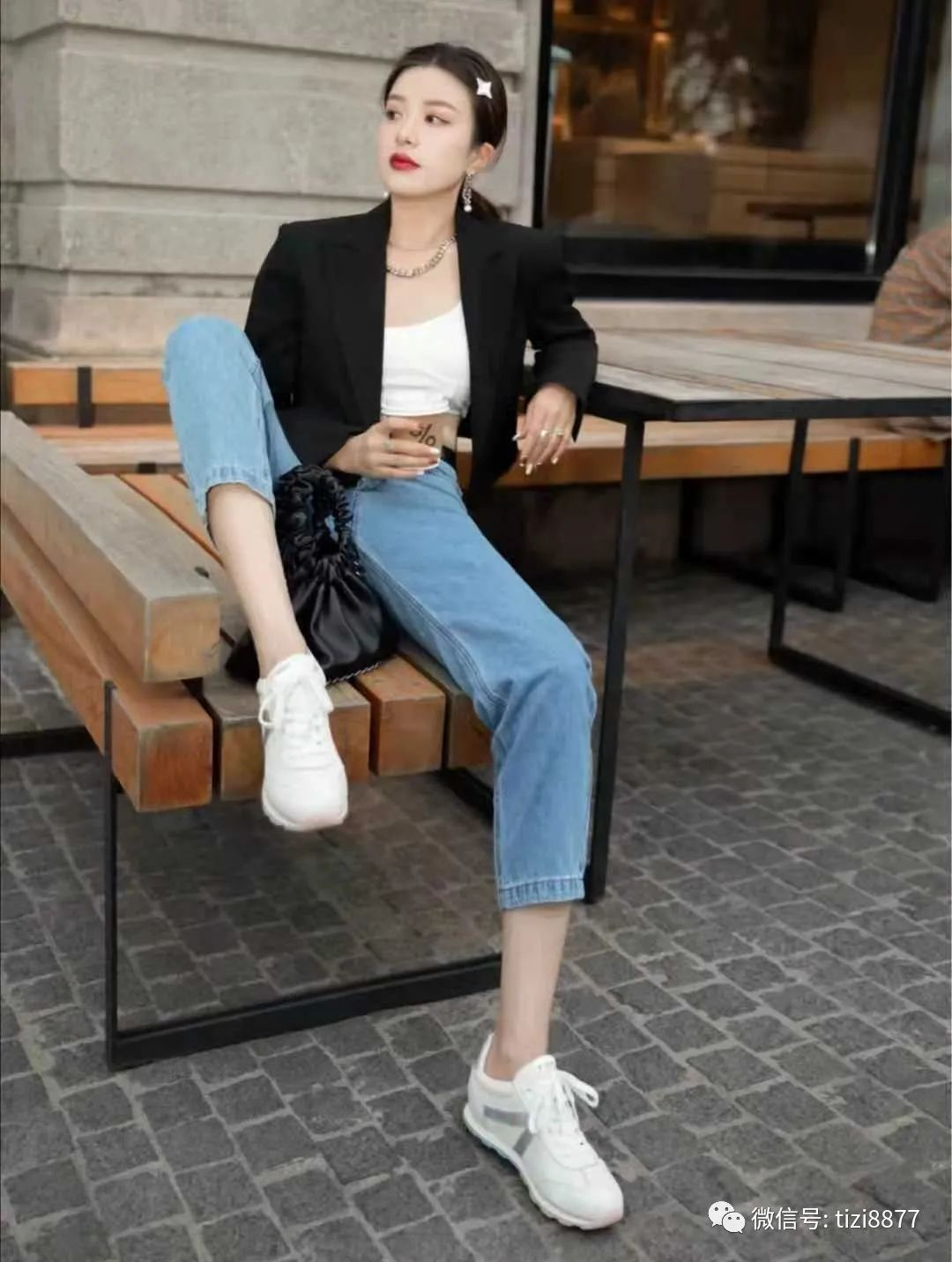 look6 黑色西装+内搭白色短胸衣+蓝色牛仔裤+浅米色运动鞋