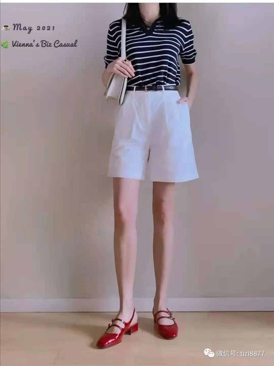 这身搭配的单品都是简约法式元素,实穿又清爽。黑底条纹会比白底更显瘦,但白底更清爽,而且宽松的短袖也能遮住手臂的肉肉;下半身的白色短裤,版型挺好,裤管大显腿细,也不会太软显得没质感,细节做的恰到好处,脚上穿了法式的小红色单鞋。