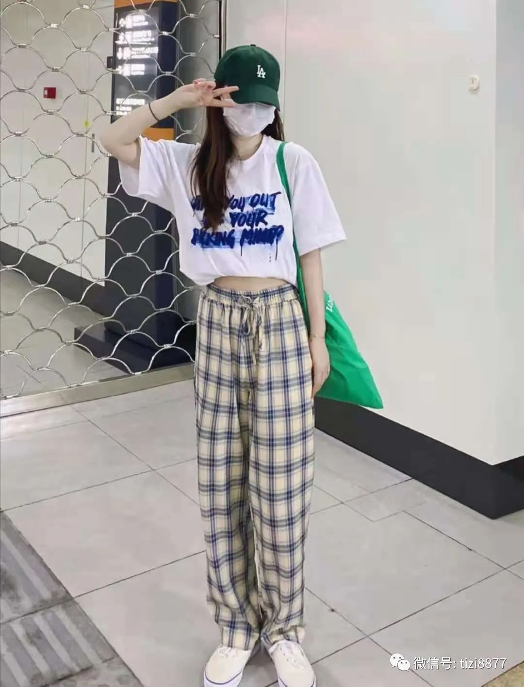 look1 蓝白配色短袖+格子裤+绿色帆布鞋