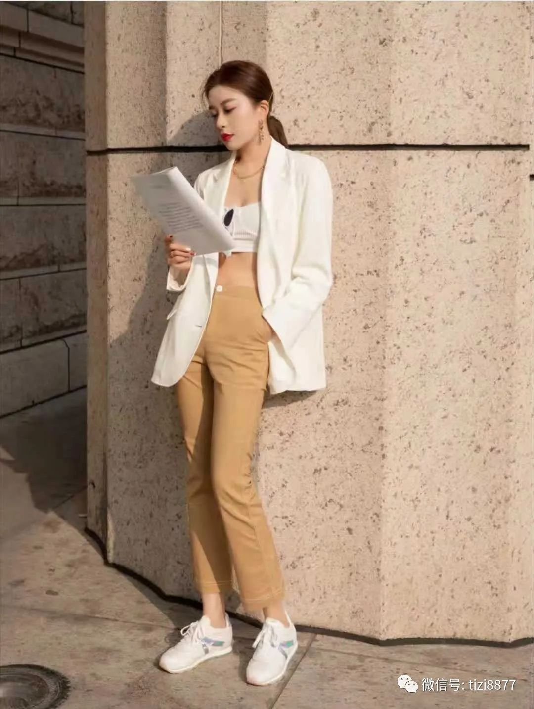 look5 白色西装+内搭白色短胸衣+棕色直筒裤+浅色运动鞋