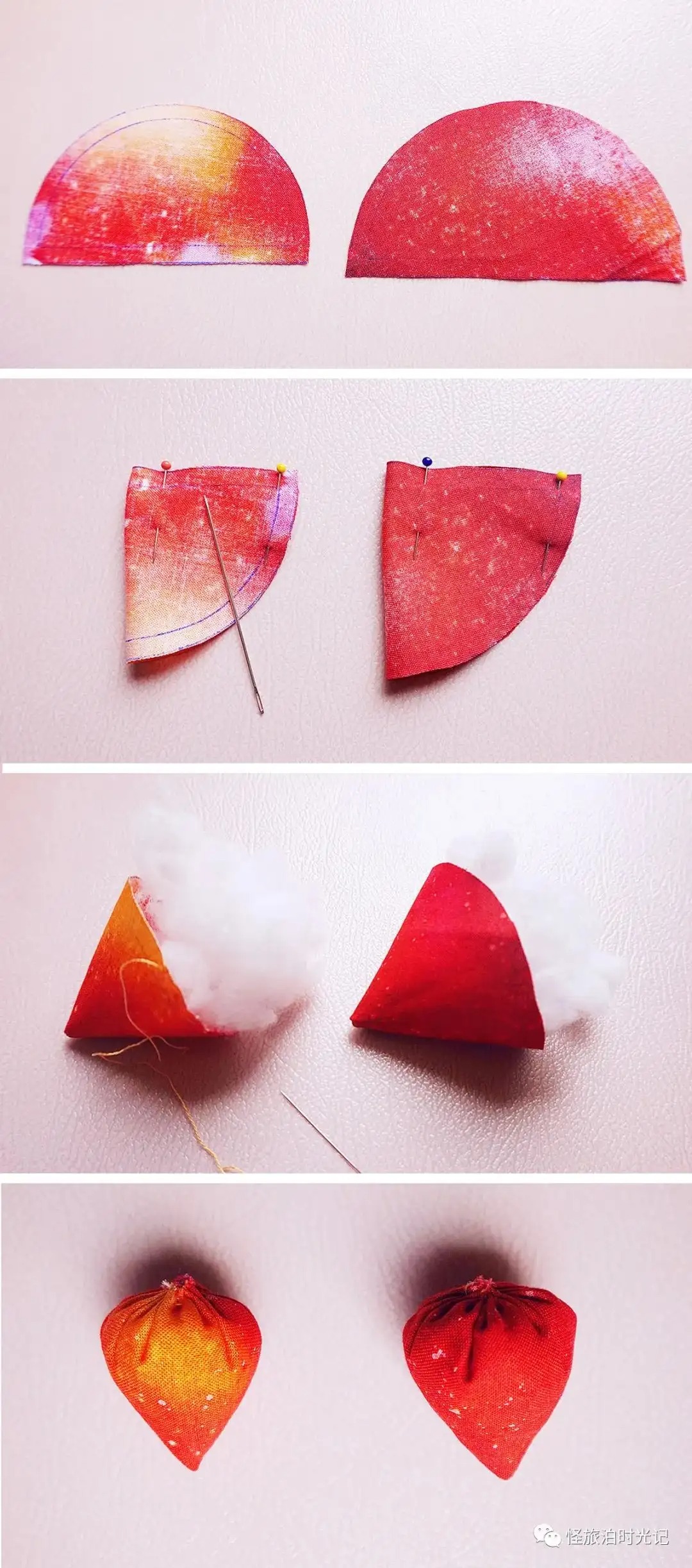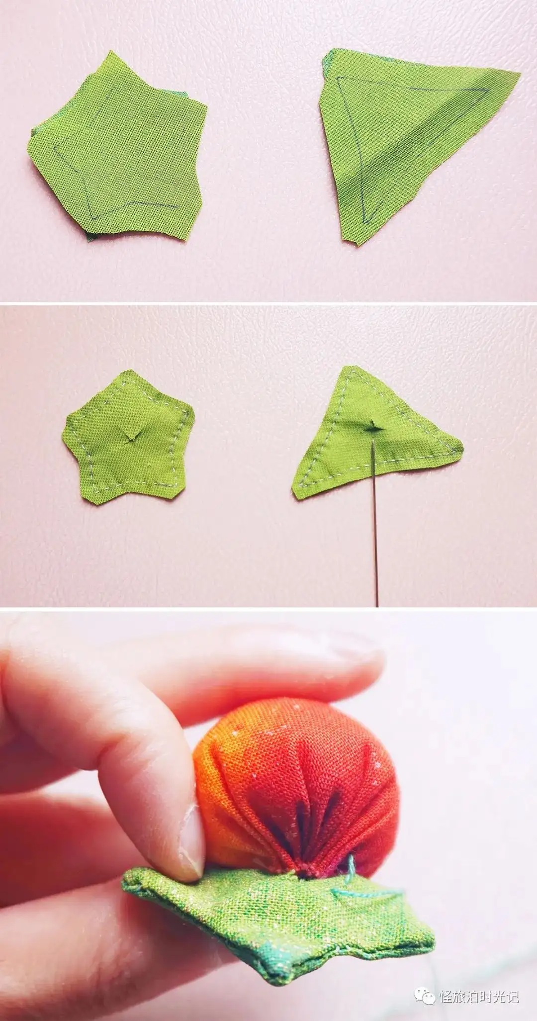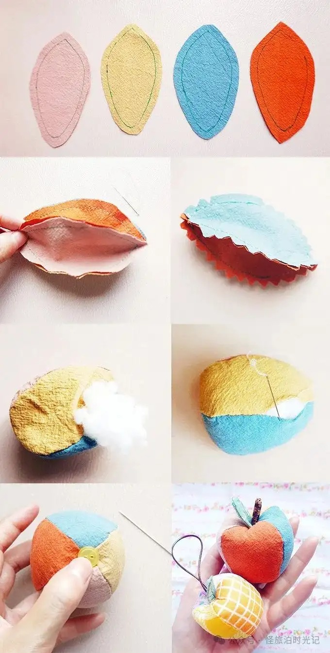 当你作为新手,准备拿起针线忙活时,出于学习的需要,一定会观看各种他人的教程,赶紧收藏起来备用。那时喜欢看的,就是此刻要发的内容:各种简单易学的布艺制作。在新手小白时期,我对手艺没有一点信心,甚至不知道怎么开始。从简单的开始做,慢慢积累了一些经验,信心便逐渐增长起来。如果你跟我一样自学,也常看别人发布的内容,有没有感觉到。很多图文教程经过无数次的转载,像素很低,模糊不清。偶尔我会突然忘记某些小物的制作,赶紧打开文件夹里,找出自己的教程看看,很方便。接下来我分享一些如何用布料制作花朵、蔬菜水果等小物的教程。都不止一个做法,稍微改一下,按自己顺手的方法做就有新的创意。针线在超市就能买到,那种一个盒子,配有好几个线轴、一包针还有顶针、穿线器。如果松一点,再拉线,就能抽紧布料,上面的制作都有用到。关于做手工的布料,当然可以用不要的旧衣服,废物利用嘛。柔软的棉布之类的就不错。雪纺则太轻飘飘了,有的人能做,我不太行。最开始不知道选什么布料,我的经验是买布组,即不同颜色不同印花搭配的一套,是店家配好的。做久了后,你可能会形成自己的偏好。喜欢某几个颜色搭配,或者某一类别布料,单独买它。总之,坚持下去,新手小白很快就能成为什么都会做的“老人”了(˵¯͒〰¯͒˵)