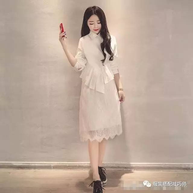 穿衣技巧:收腰的连衣裙既能突显出小蛮腰,又能遮挡住双腿,整体看上去自然显瘦!衬衫+蕾丝裙+平底鞋,简单舒适又不失性感!