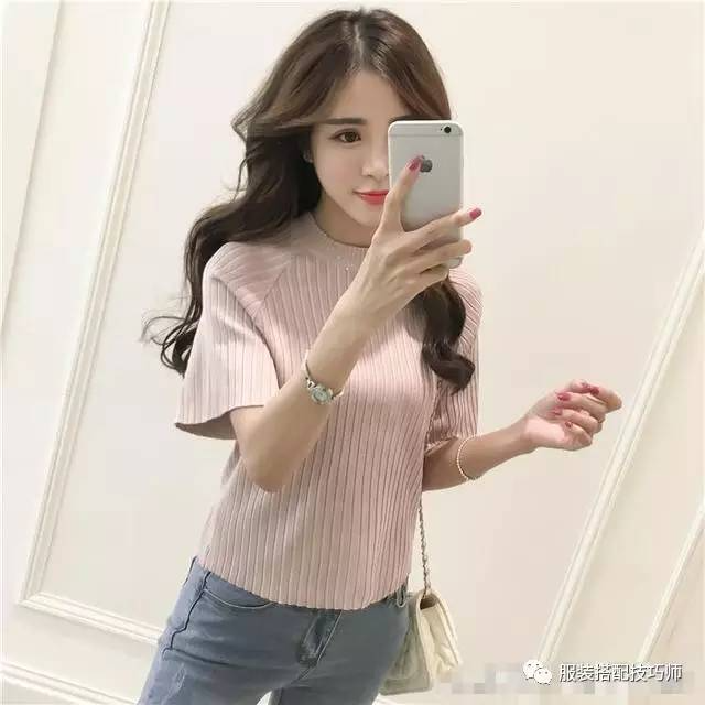 穿衣技巧:时髦的短款上衣就很适合平胸的妹子,有一种小清新的感觉!大胸妹穿的话让人感到艳俗了!短款上衣+牛仔裤,更显你腿长,竖款的针织条纹还能在视觉上面达到显瘦的效果!