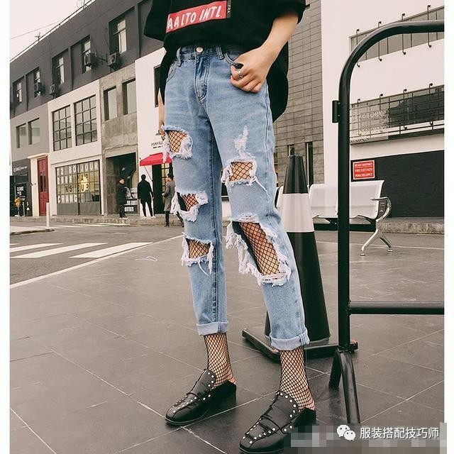 穿衣技巧:建议方形身材的美眉们选择宽松版型的破洞牛仔裤增加下身的宽度,同时要求你上半身穿修身的衣服收缩宽度,这样曲线就出来了!今年流行的破洞牛仔裤+渔网袜+平底鞋,迎面扑来满满的潮气啊!