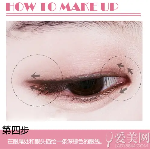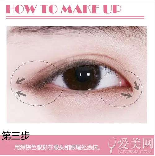 在眼周涂抹深色眼影,利用眼部的阴影效果增加双眸。浅棕色晕染也不会造成太明显的妆容效果。