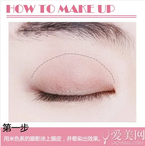 第一步,先用米色系的眼影涂上眼皮,并晕染出效果。