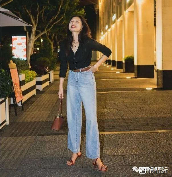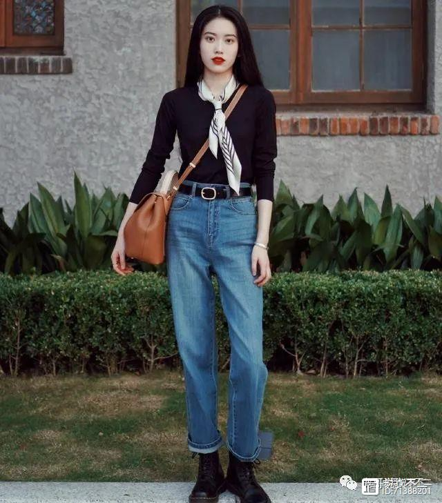 黑色紧身上衣搭配宽松牛仔长裤和黑色马丁靴,是干练帅气又不失女人味的穿搭典范,黑色的紧身上衣能够包裹出玲珑的曲线,显得更加性感,蓝色的牛仔裤经典又百搭,再加上一条黑色的小皮带,增添了时尚感,如果觉得有点单调的话,可以加上一条精致又优雅的丝巾,立马变得让人过目不忘。