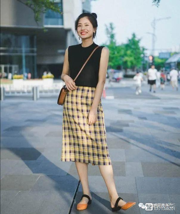 黑色无袖工装上衣搭配黄色格纹半身裙,酷炫和甜美的精彩碰撞,无袖的短上衣看上去更加的率性干练,大方的展示出手臂的线条,避免了上半身的臃肿,使整体造型更加的精简,也显得身材更加的纤细,黄色格纹半身裙非常的减龄,带来甜美的青春气息。