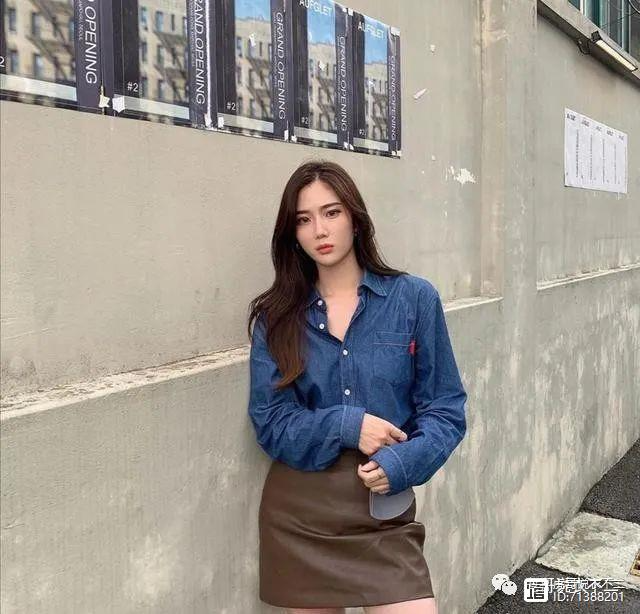 牛仔衬衣搭配深棕色小皮裙,酷劲十足又尽显女人味,牛仔衬衣的扣子并不扣的十分严实,松松垮垮的穿在身上,透露出一种慵懒的迷人气息,又显示出一种漫不经心的性感味道,皮质小短裙给整个造型增添了高级感和性感气息。