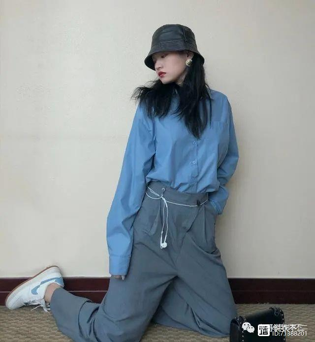 一件蓝色衬衣搭配深蓝色宽松工装裤,虽然这套穿搭都是蓝色系,可是饱和度却略有不同,塑造出了视觉上的层次感,温柔的蓝色系能够给人一种眼前一亮的感觉,裤装采用颜色更深的深蓝色,也增强了显瘦的效果,对身材的包容度更高。