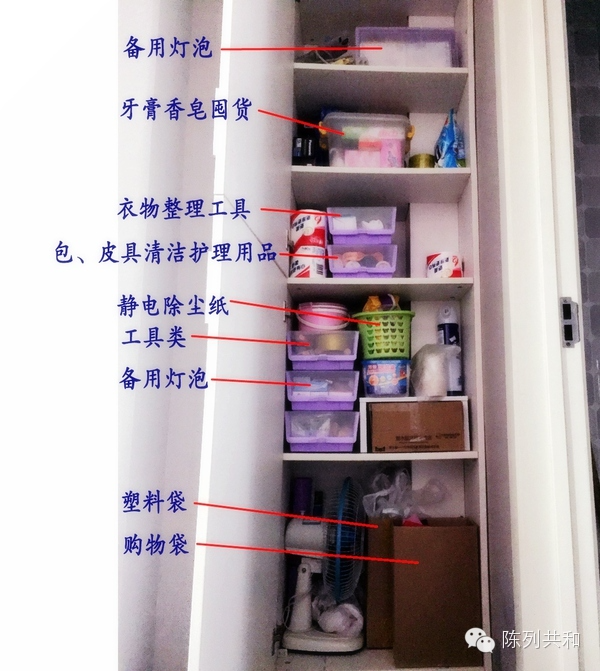 这个图需要解释一下,所谓衣物整理工具就是毛球修剪器啦、粘毛滚筒啦之类的;备用灯泡很多是因为我有强迫症,受不了忽然一个灯不亮了,我必须马上换上才行(啊谁打我);塑料袋我是这样直立收纳的,节约空间,方便抽取。购物袋是叠起来的,平时用不到,搬家的时候才会大量用到。
