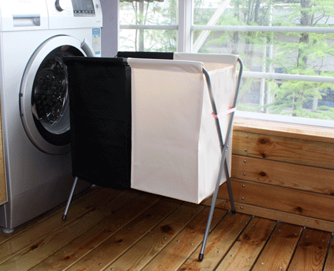 选择有支架或可以挂起来的、分为两格的脏衣篓。