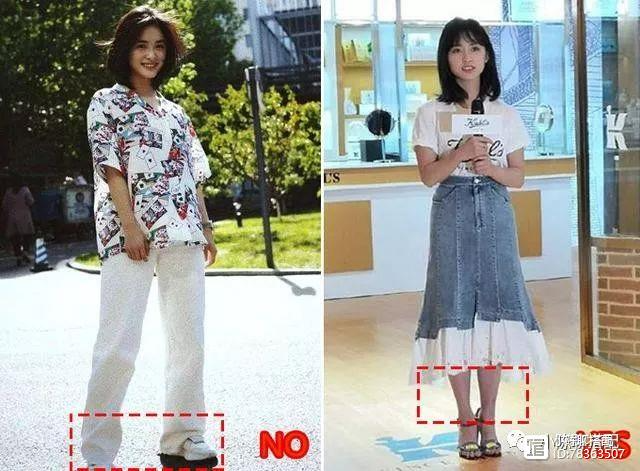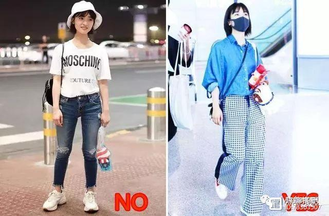 如果说前面3种“遮肉”法则对矮胖姑娘来讲还用不到,但小短腿基本是矮胖姑娘都会遇到的身材短板。那么对它的“遮肉”法则我们该怎么办呢?先看沈月的这组对比图,打NO穿紧身牛仔裤的搭配,明显穿出了五五分身材,显短和腿粗,而旁边Yes所穿的阔腿裤就要遮肉很多,加之看起来脱离了五五分,也就显高了不少。