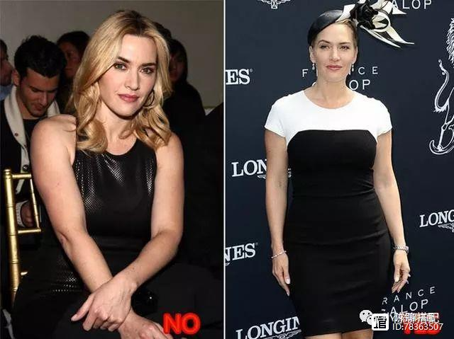 手臂粗是矮胖姑娘普遍存在的问题,为了营造手臂看起来很瘦,我们就要选择对“遮肉”有利的单品,就拿上图美国演员凯特-温斯莱来讲,难以掩盖的麒麟臂,在穿吊带和短袖上,明显穿短袖遮掩了很有肉的手臂,在视觉上就会显瘦很多。