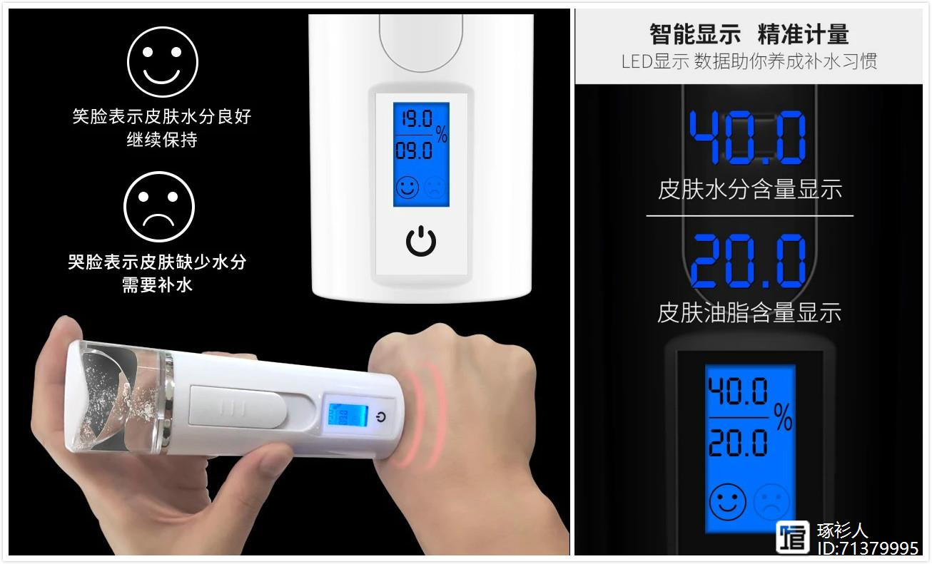 并且它还可以测皮肤的状态,上面有一个电镀金触点,用它接触皮肤的时候能测出皮肤含水量多少,油脂含量多少,当皮肤缺水时,上面会有一个哭脸,特别有趣。
