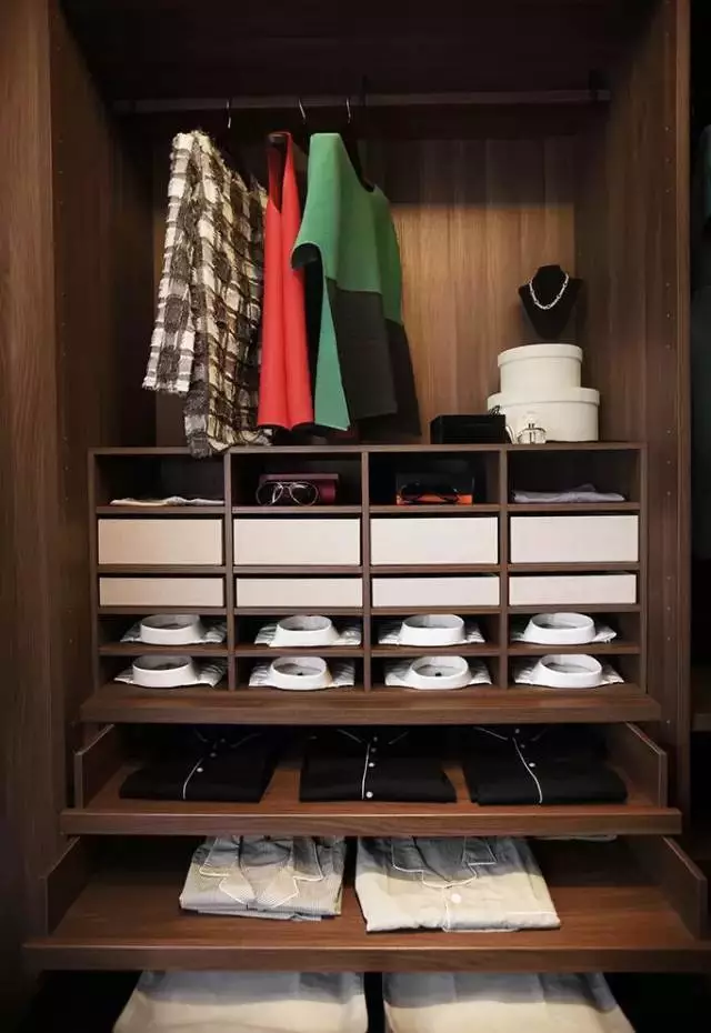 最好设置小物件区,毕竟内衣内裤是贴身物件,还是要跟外穿衣服分开,找起来也比较方便,衣柜设计时,可以预留几个抽屉,用来存放
