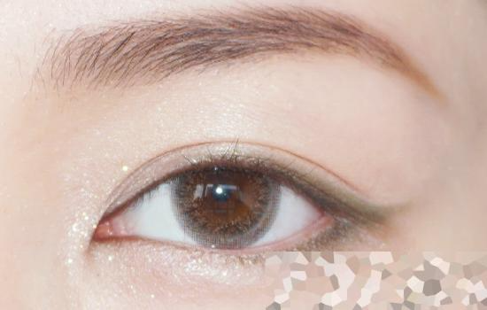 小清新绿色眼妆教程第三步:这个步骤我们是画内眼线,因为这个步骤也是本次妆容的重点部分,所以我们是选择棕色眼线笔画好内眼线,填满睫毛根部,拉出眼尾并微微上翘。