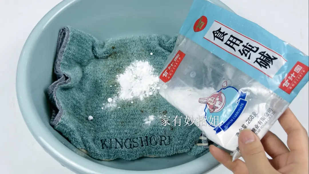 那我们该如何清洁毛巾呢?方法其实也很简单,我们先把要洗的毛巾放在盆中,然后倒上一些食用碱在毛巾表面。食用碱大家都很熟悉,它超强的碱性就具有很好的清洁作用,可以帮助把毛巾上的脏污给清洁掉。