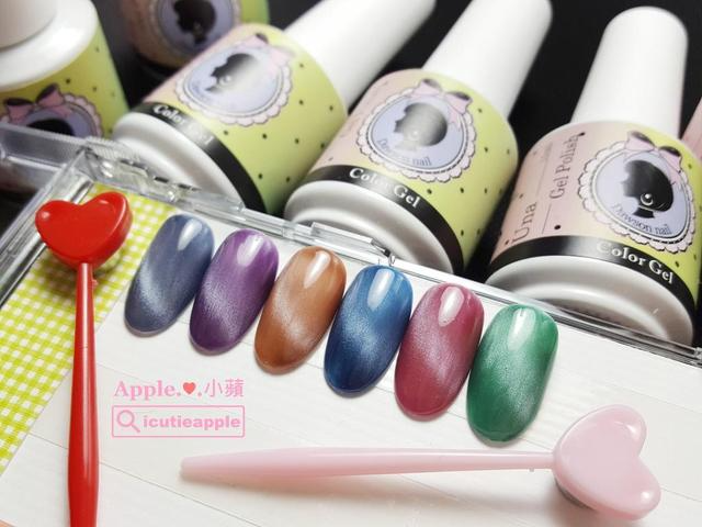 ▲色卡上的猫眼纹路,我是使用照片中的爱心磁棒来磁吸,猫眼效果较发散,我个人认为比集中成直线的猫眼还要自然好看~给大家参考看看^^ 如果对于大森Una甲油胶系列极光磁石胶的使用心得有兴趣,可以参考小苹这篇文章→ 【美甲彩绘】甜美花卉&日式工艺风格华丽指彩❤大森美甲Una系列凝胶新上市开箱大森Una甲油胶系列极光磁石胶新色-海洋磁石胶及爱心磁棒→来源:大森美甲Dawson nail