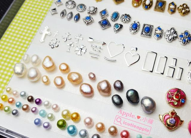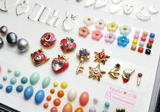 ▲中间是很精致的美少女战士饰品。坊间有很多美少女战士的美甲饰品,但这些是我看过品质在水准之上的饰品,而且背面有服贴甲面弧度的贴心设计,好惹人爱哟~不晓得大家比较喜欢哪一款,我私心好爱那颗五彩星钥,五彩的星星钻饰真的很美,美到舍不得用~这是卷办才好XDD 对了,小苹曾经用过右上方的小方块饰品做美甲作品设计,还蛮多人询问在哪里买的,其实目前我手边的饰品,绝大多数都入手自Mageechu小啾店长,包括这款小方块饰品也是喔^^
