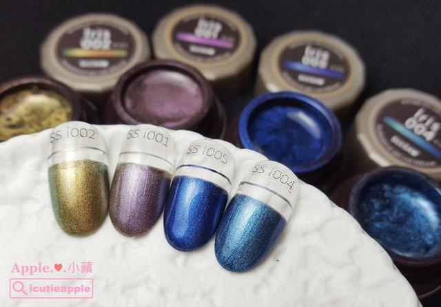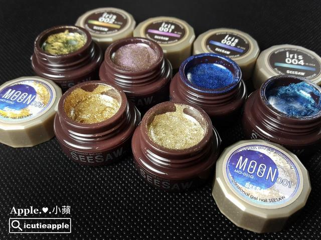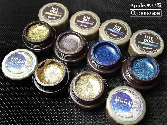 ▲日制品牌SEESAW彩胶(2.5ml) iris系列的颜色,有点金属感的变色龙色,每次快接近冬天时,常常都会看到她们出现在各大日杂上,胶体一样很滑顺、好涂布,也很适合拉线~极推荐哟!!!