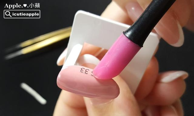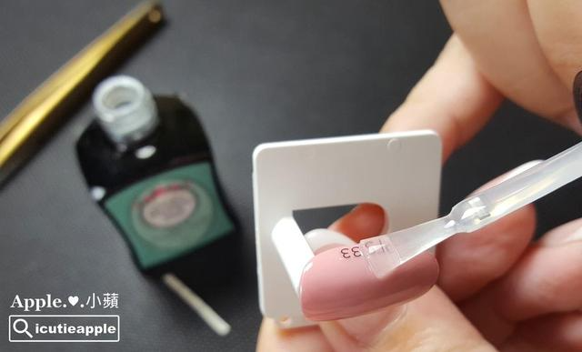 ▲使用BLC金镊子夹取色号标签,摆放于适当位置。这次小苹特别挑选爱用色大森Puffs Gel泡芙罐装彩胶#33来作示范,这个颜色很柔美,不论单色涂布或是渐层效果,都非常有气质^^ 黏贴色号标签前,有两种作法:第一种作法:彩胶2层后,照灯除胶,再黏贴色号标签;第二种作法:彩胶2层后,涂上免除上层,照完灯固化后,再黏贴色号标签。我是使用第二种作法,主要是我懒的除胶,其次是因为我是分批将所有色卡全部开箱涂布完毕,再按照自己喜欢的排序先分类好,最后才一起黏贴色号标签,我觉得这样会比较快,不过还是提供2种方法让大家参考,妳们可以选择自己顺手的方式来作业^^