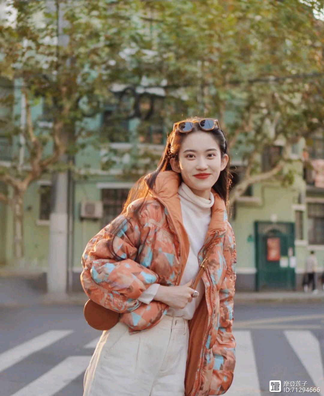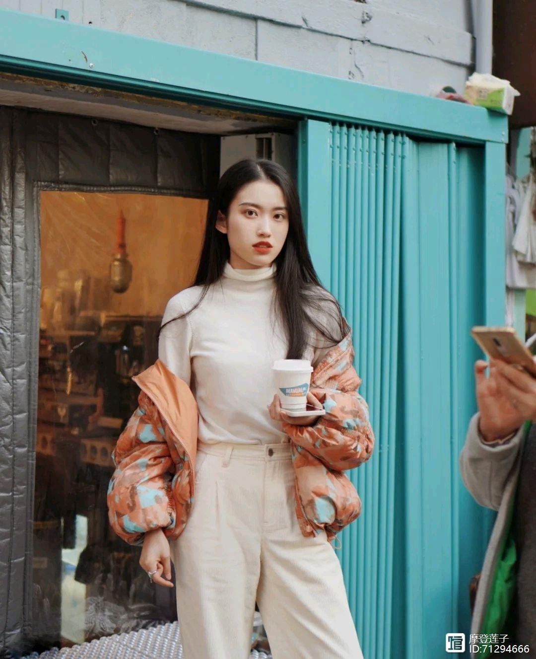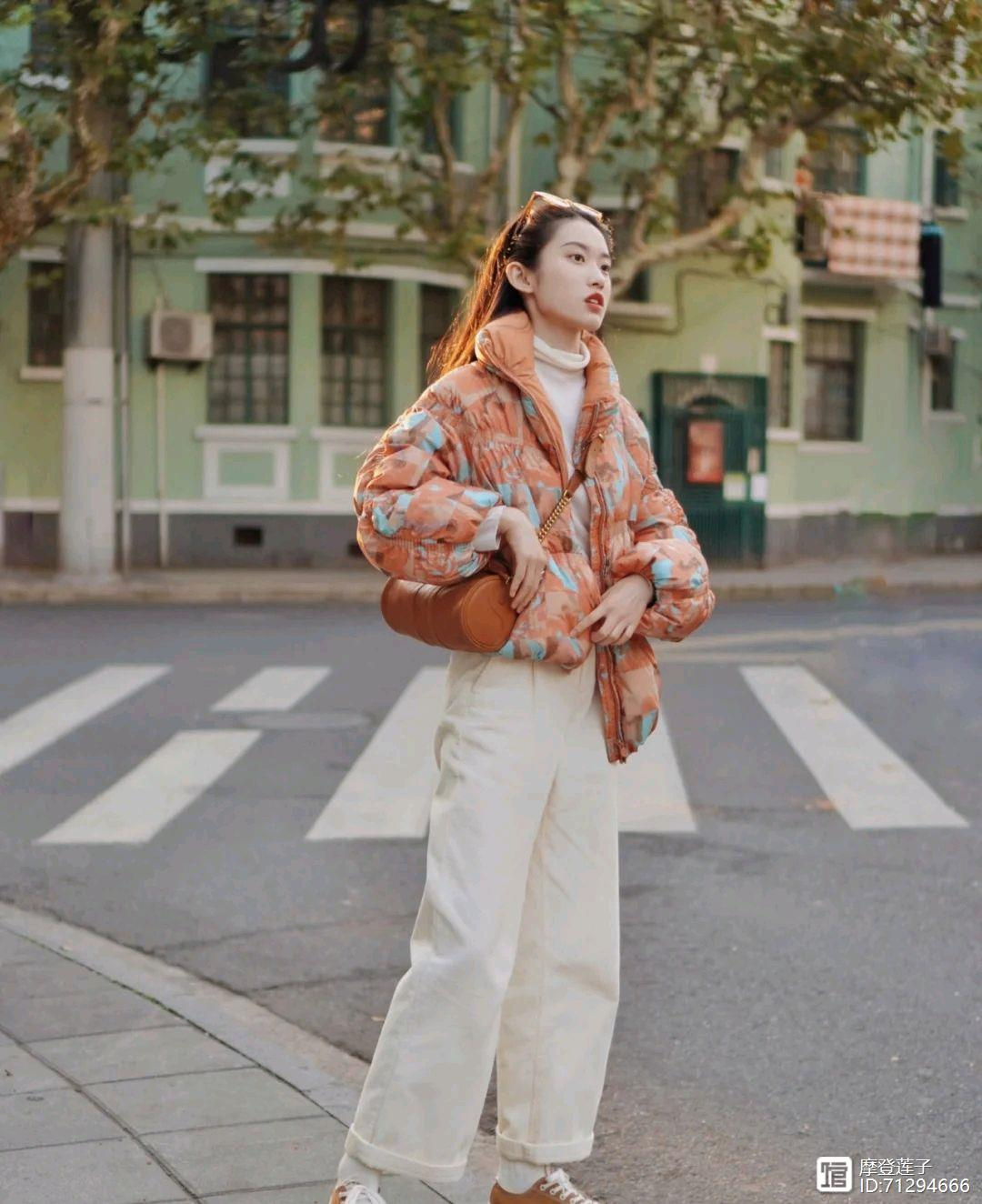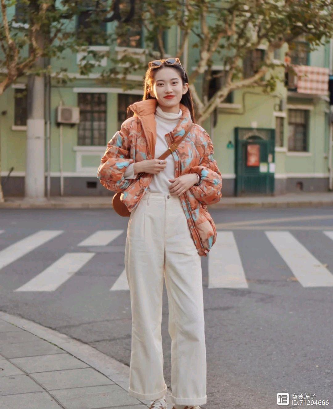一、橙色羽绒服+白色直筒裤+白色毛衣