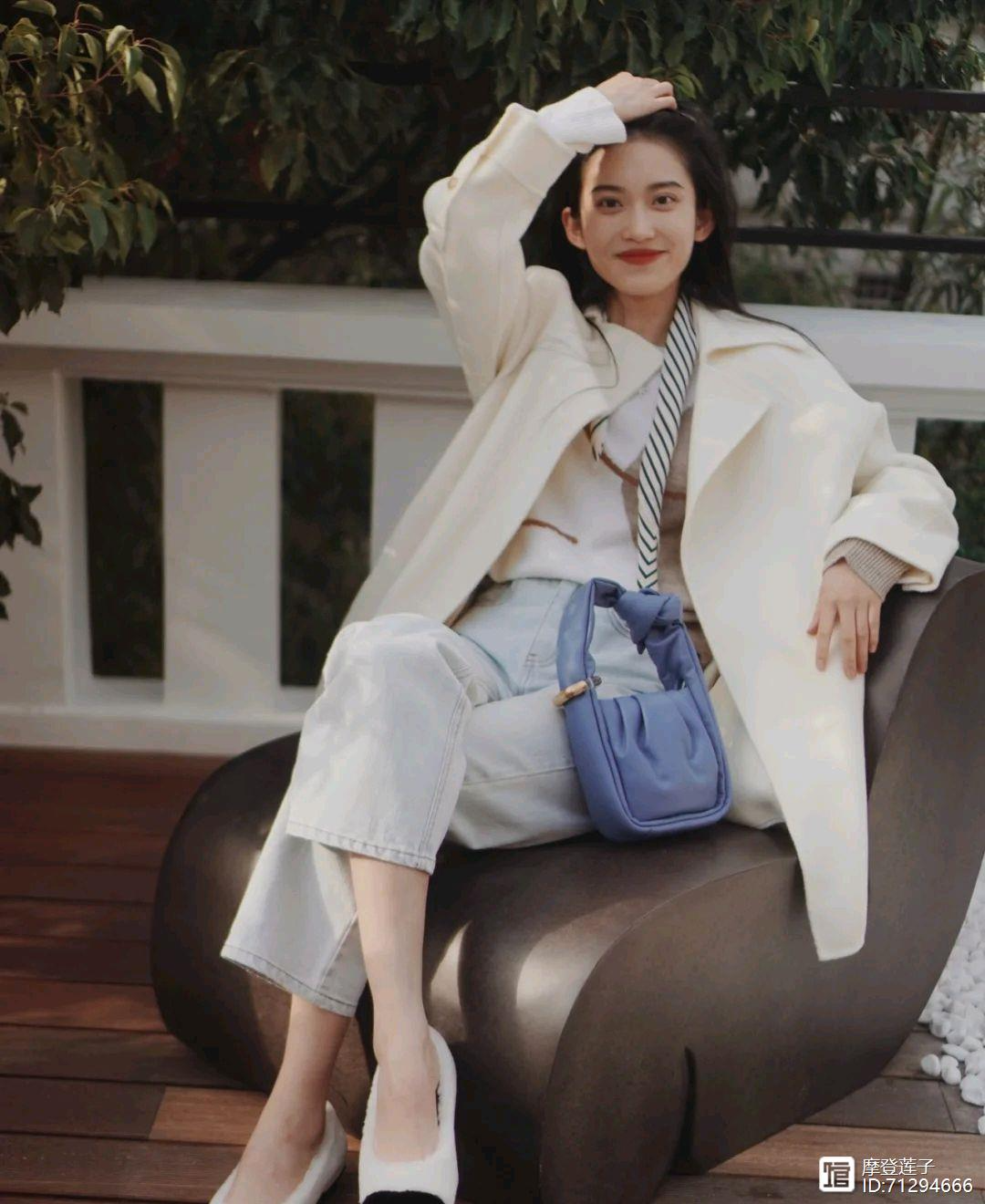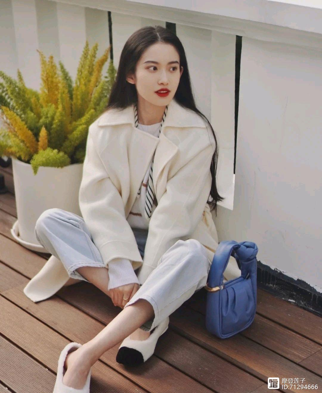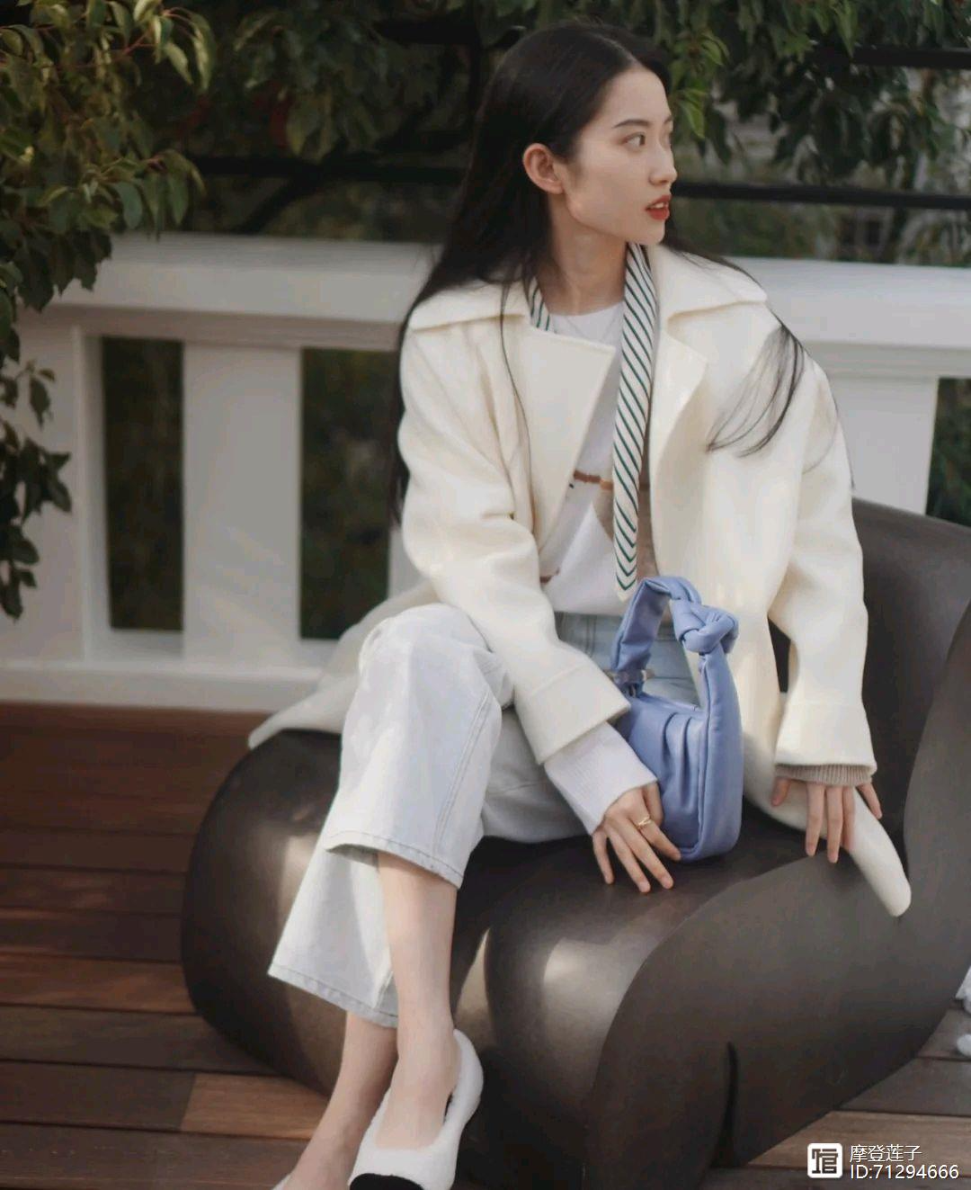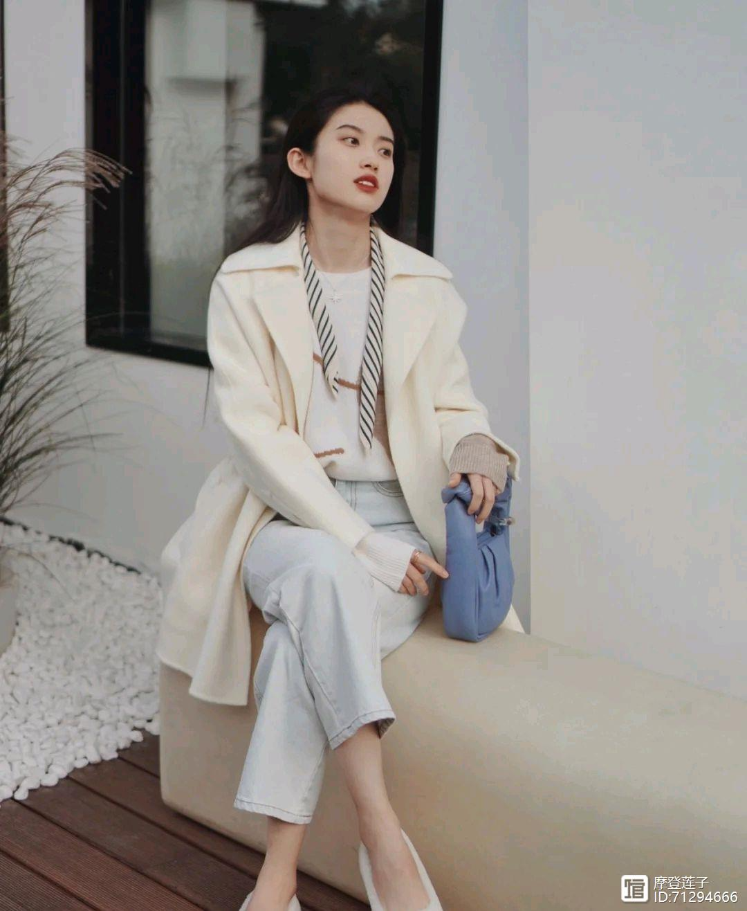 这身穿搭之所以呈现出很温柔的感觉,那是因为这身穿搭是以浅色为主调,不管是大衣还是内搭,包括牛仔裤都是以浅色为主,所以整体穿搭造型呈现出了清清爽爽的感觉,在一定程度上还可以把肤色衬托得很白皙,很轻松就能起到减龄的作用,并且还呈现出温柔的气质。