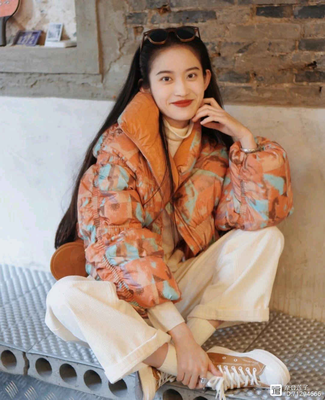 她选择了带有蓝色花纹的橙色羽绒服搭配白色直筒裤,并且还选择了白色高领毛衣作为内搭,给人一种耀眼夺目的感觉,很轻松就能在人群中脱颖而出。