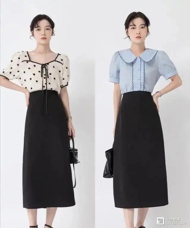 蓝色娃娃领衬衫和黑色裙子的结合既有稳定的感觉,又不会显得太成熟。相反,它可以通过这种清新的以削弱它的沉重感,非常知性和气质。基本类型的过膝裙,往往有一些共同的特点,一是它们都有非常耐用的优点,二是配色没有明显的约束力。
