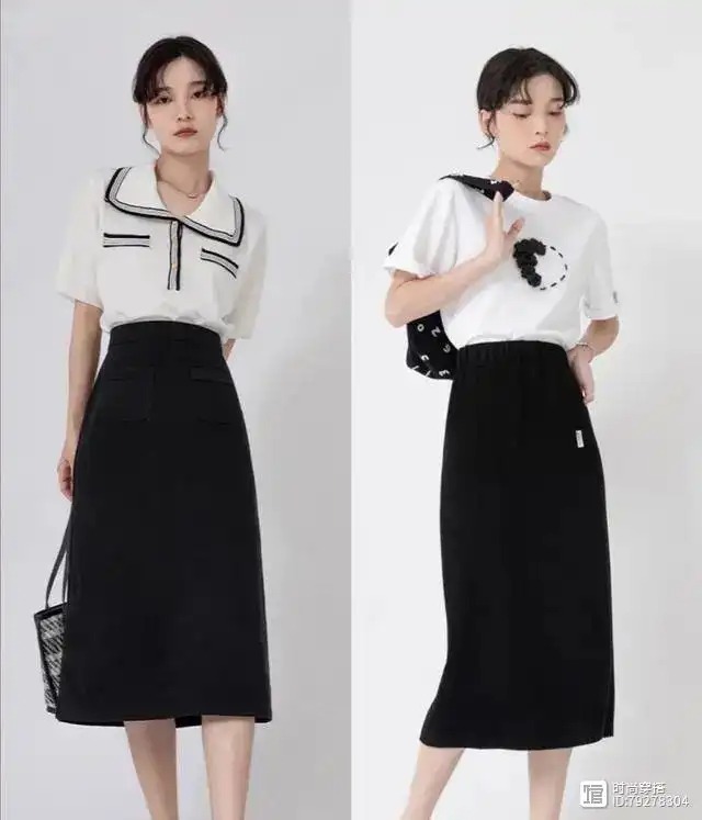 黑色T恤可以增加对身体曲线的包容性,尤其是腹部的一些缺陷。借助这种典型的颜色,它可以弱化圆润感。搭配的牛仔裤不能太紧,可以是浅蓝色的裤子,这样可以减龄。短上衣不仅可以搭配整齐的裤子,还可以搭配过膝长裙。由此呈现的造型没有相似的风格,反而可以让女性的形象时刻更新,时刻变化,时刻保持一些差异。如果采用色彩基础大方的过膝裙,上身单品的选择会更加自由。你可以用典型的黑色连衣裙来搭配薄薄的连衣裙,这样穿起来就不难了。黑色过膝裙可以创造各种组合模式,它不会对上半身的服装风格有特定的限制,但可以让女性选择她们满意的物品。无论是有设计感的衣服,还是和它一样简单的衣服,都可以成为穿衣的替代选择。