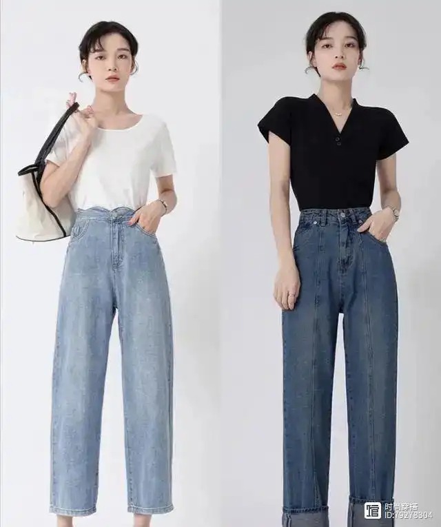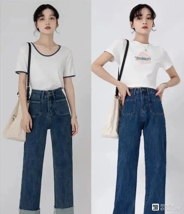 这组搭配是一件非常新鲜的白色t恤和普通的宽松牛仔裤,把t恤的下摆塞进裤子里,可以缩短夹克的长度,创造高腰线,优化比例。各种颜色的T恤都可以搭配蓝色牛仔裤,非常和谐。无论是黑色还是白色,它们都是最熟悉、最值得信赖的两组颜色。它们可以搭配大气高挑的衣服。