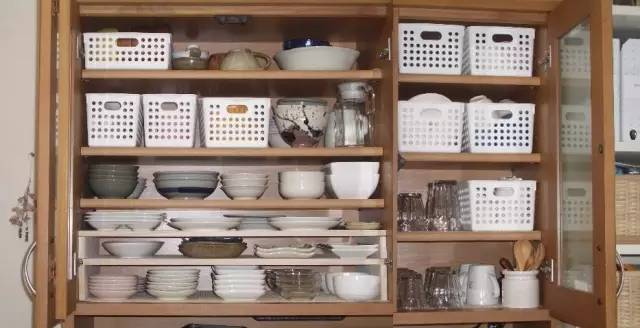 接下来是最重要的盘子碗的摆放。简单的分类固然是必须的,但是添上一两件“辅助”收纳道具显得美观上天衣无缝。看看她们怎么摆放的吧~