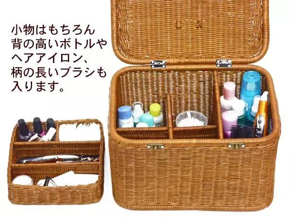 这种竹编的化妆箱一般较常见。内部可根据需求调节长款,搭配自己需要的收纳空间。
