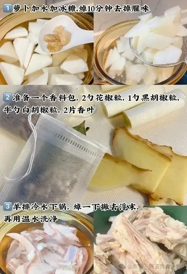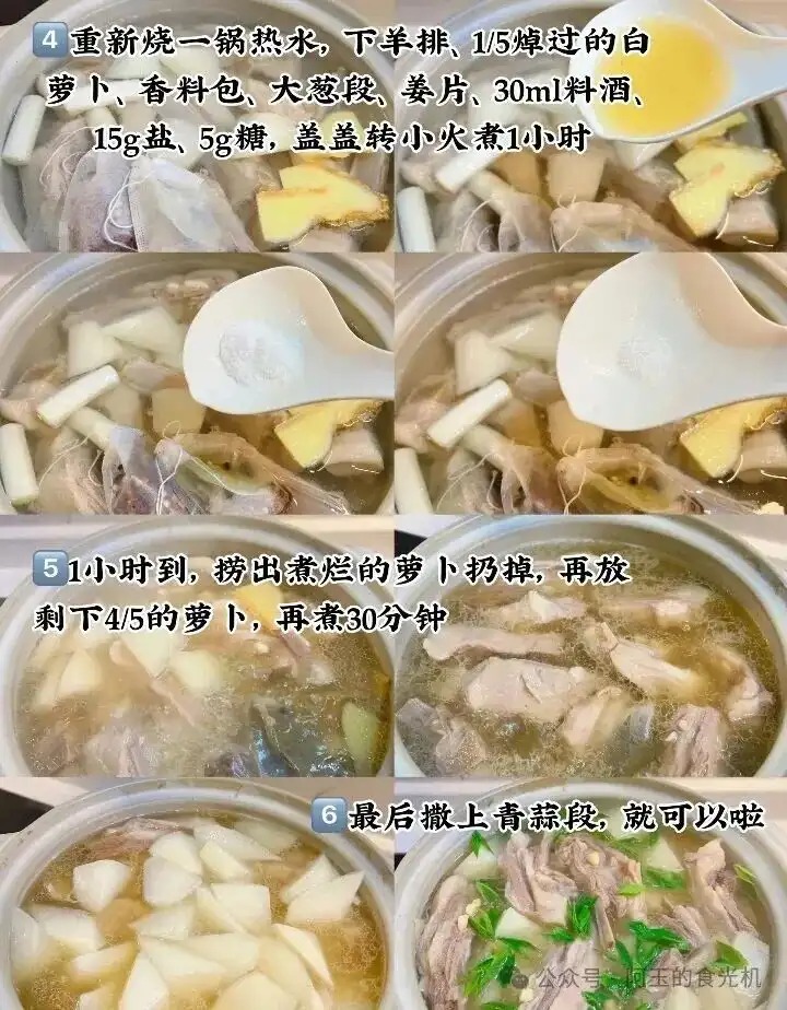 3️⃣另烧一锅热水,下羊排、下一半白萝卜、香料包、大葱段、姜片、料酒、盐、糖盖盖转小火煮1小时