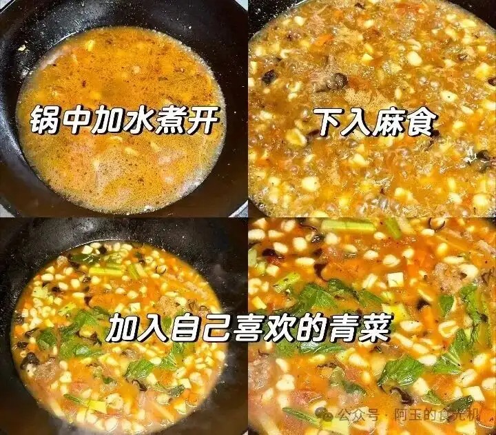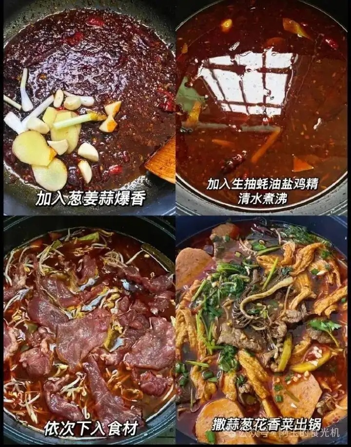 1️⃣先将火锅底料炒香,加入葱姜蒜爆香,加入生抽、蚝油、盐、鸡精、清水煮沸