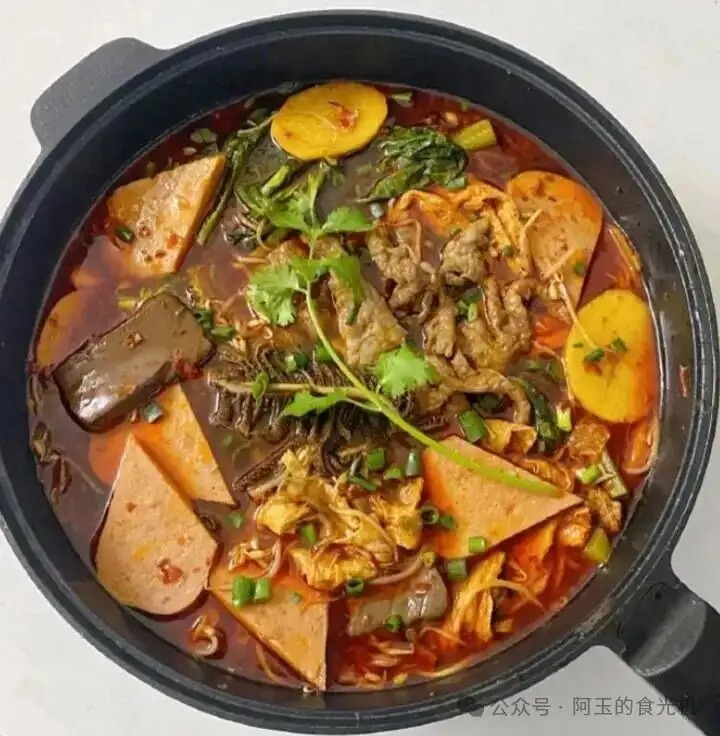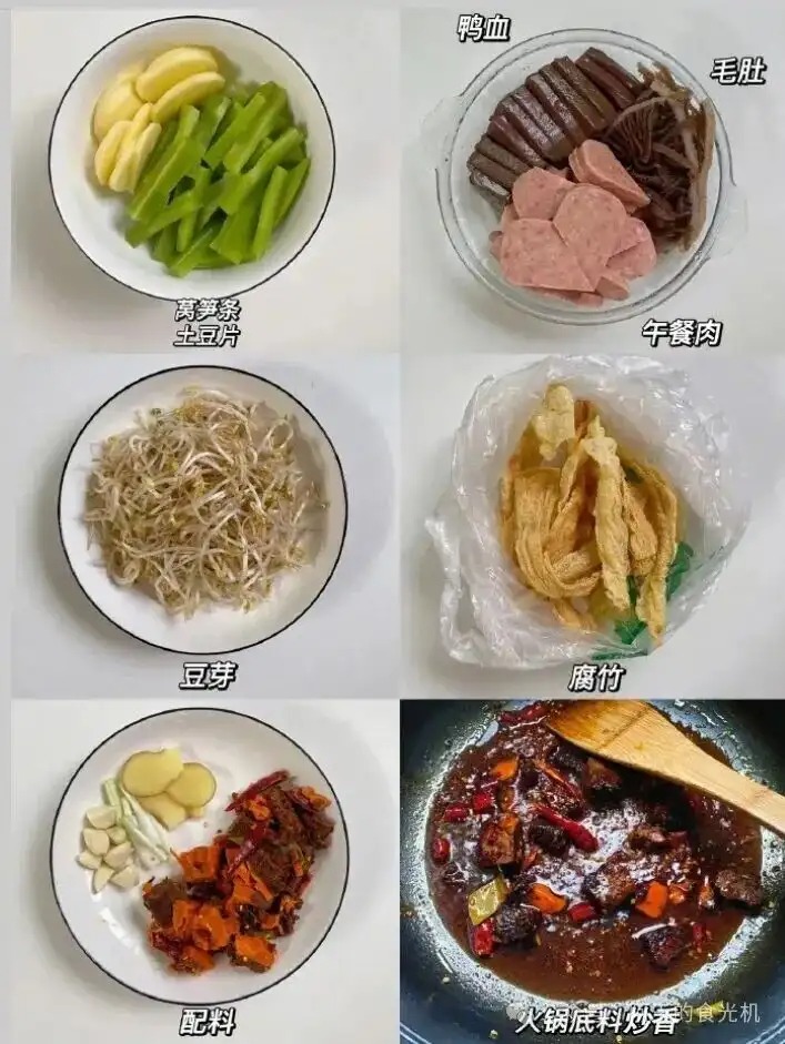 莴笋、土豆、鸭血、毛肚、午餐肉、豆芽、腐竹、火锅底料