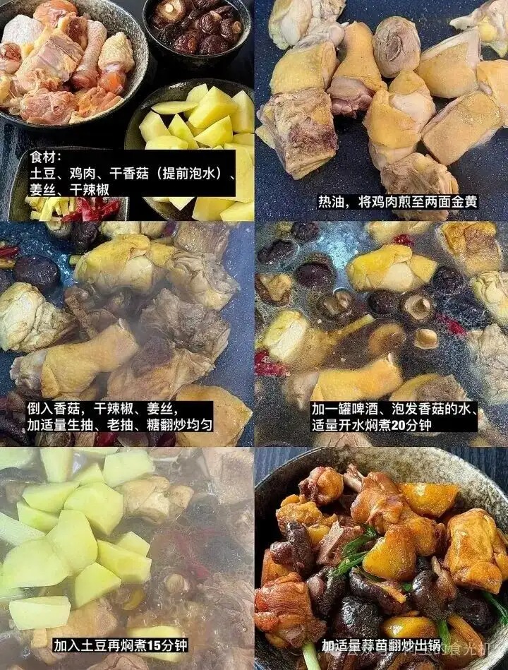土豆、鸡肉、泡好的干香菇、姜、干辣椒