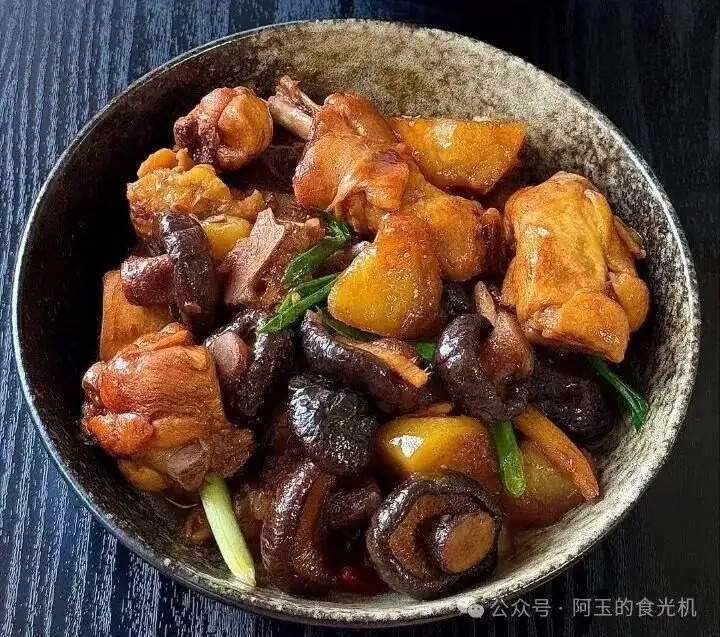 2️⃣加一罐啤酒、泡发香菇的水、适量开水焖煮20分钟,加入土豆再焖煮15分钟,放蒜苗翻炒出锅