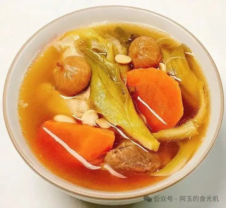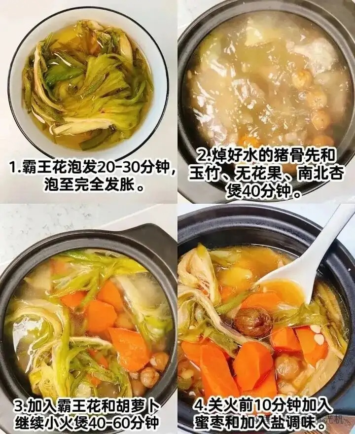 2️⃣加入霸王花和胡萝卜继续小火煲50-60分钟,出锅前10分钟加入蜜枣和盐调味
