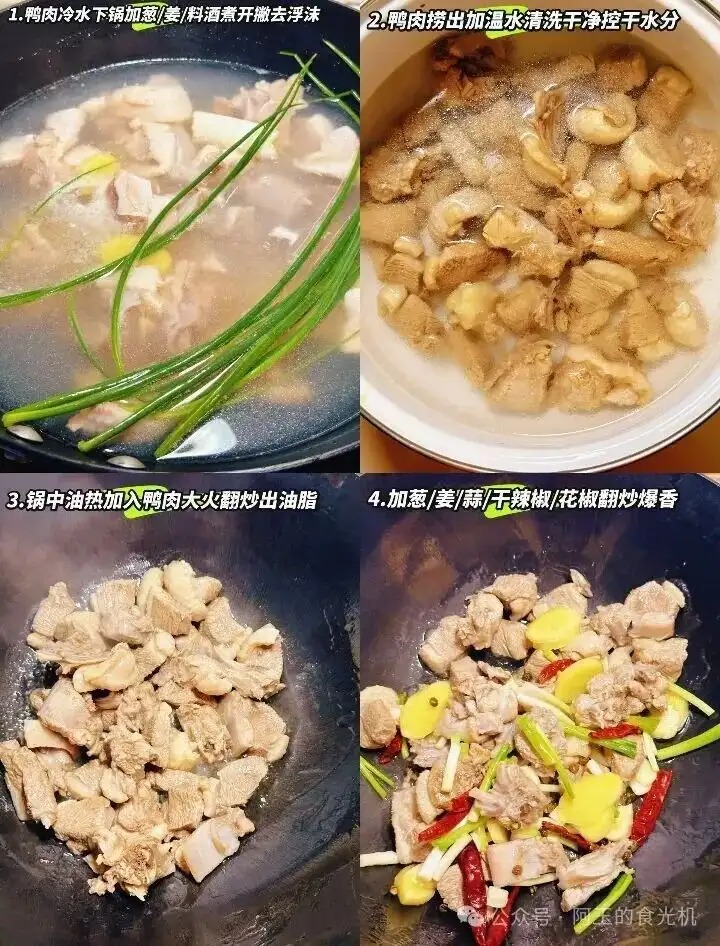 2️⃣锅中油热,下鸭肉煸炒出油脂,加葱、姜、蒜、干辣椒、花椒爆香