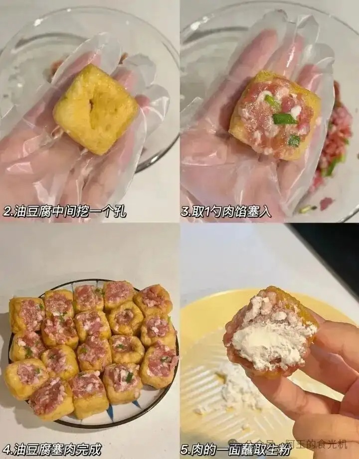 2️⃣油豆腐中间挖一个孔,塞入适量的肉末,肉的一面蘸上生粉